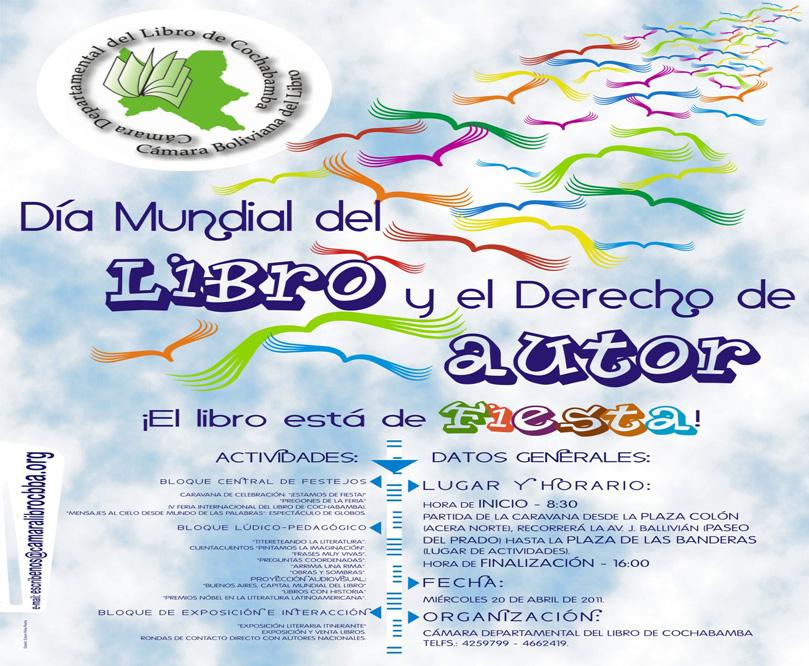 La Cámara Departamental de Cochabamba invita al Día Mundial de Libros y derechos de Autor se realizará este miércoles 20 de abril desde las primeras horas. El lugar de concentración será, en la plaza colón, paseo del prado y plazuela de las banderasPodrá participar exposición de editoriales asociadas presentación de escritores nacionales y actividades culturales y recreativas acompañamiento con bandas estudiantiles de guerra.